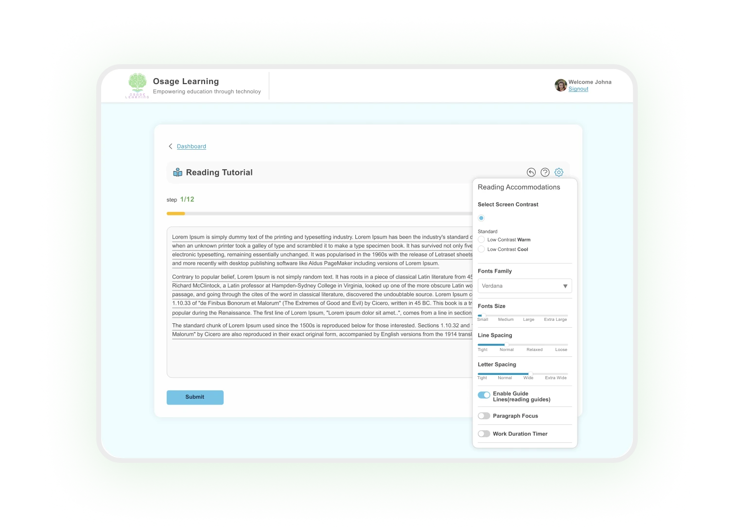 Turn on the reading ruler tool and watch subtle lines appear beneath every row of text, keeping letters stable so your child focuses on meaning, not placement.
